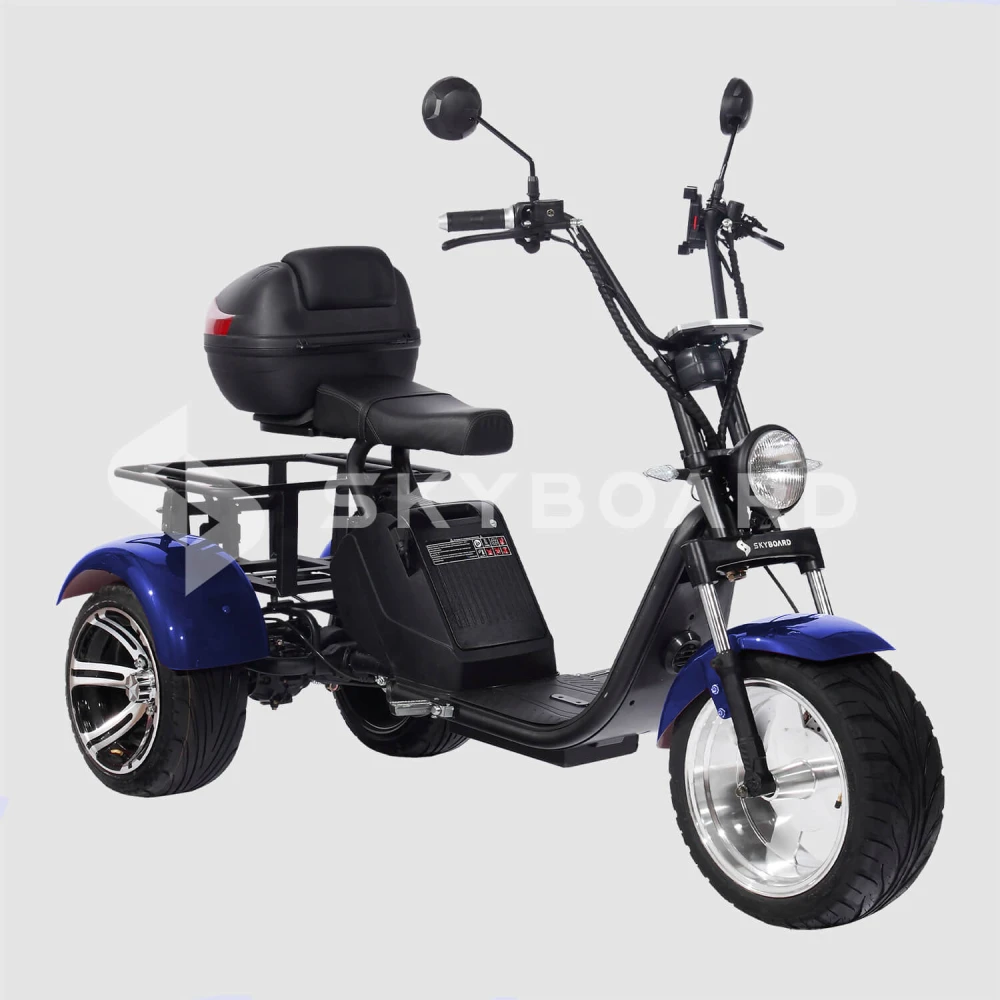 CITYCOCO SKYBOARD TRIKE BR80 Синий – трёхколёсный электроскутер, что даёт ему немалые преимущества. Во-первых, это прекрасное сцепление с дорожным полотном. Во-вторых, это великолепная устойчивость – опрокинуть данную модель скутера почти также сложно, как и автомобиль. Широкая задняя часть скутера позволила расположить там пару отсеков для перевозки вещей – максимальная нагрузка 200 килограмм. Скутер способен развивать скорость достигающую 39 км/ч. На одном заряде вы сможете преодолеть до 40 километров. Комфорт при поездках обеспечивает эргономичное сидение, удобно расположенные зеркала заднего вида, яркие габаритные огни и мощная лампа. Стоит отметить и приятный дизайн модели с синими элементами, добавляющими ей яркости и броскости.