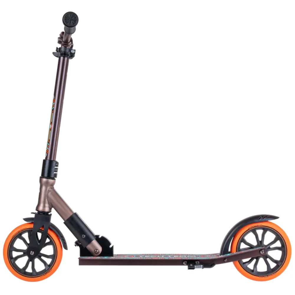 Дека – широкая и нескользящая, увеличивает степень безопасности ездока при движении на максимальных скоростях и маневрировании. Колесная часть – полиуретановая, мало стираемая, накатистая. Торможение – заднее, ножное.