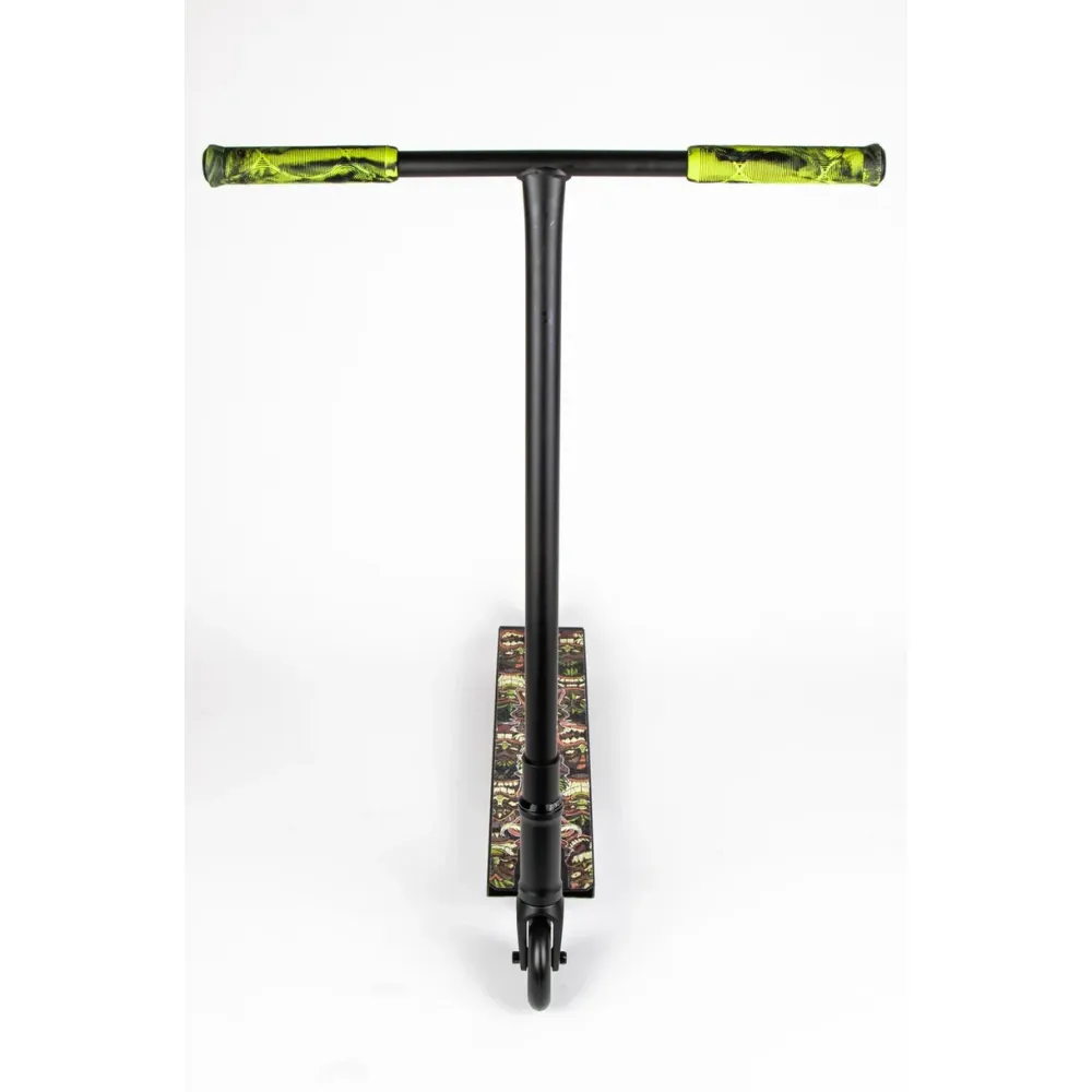 Транспортное средство весом 4,25 кг оснащено Т-образной рулевой системой, изготовленной из хромолевой стали. Высота руля – комфортная для выполнения сложных и легких трюков, составляет 88,5 см. Дека широкая, удобная для стоп, не допускает неверных движений и соскальзывания. Колесная часть полиуретановая, долговечная.